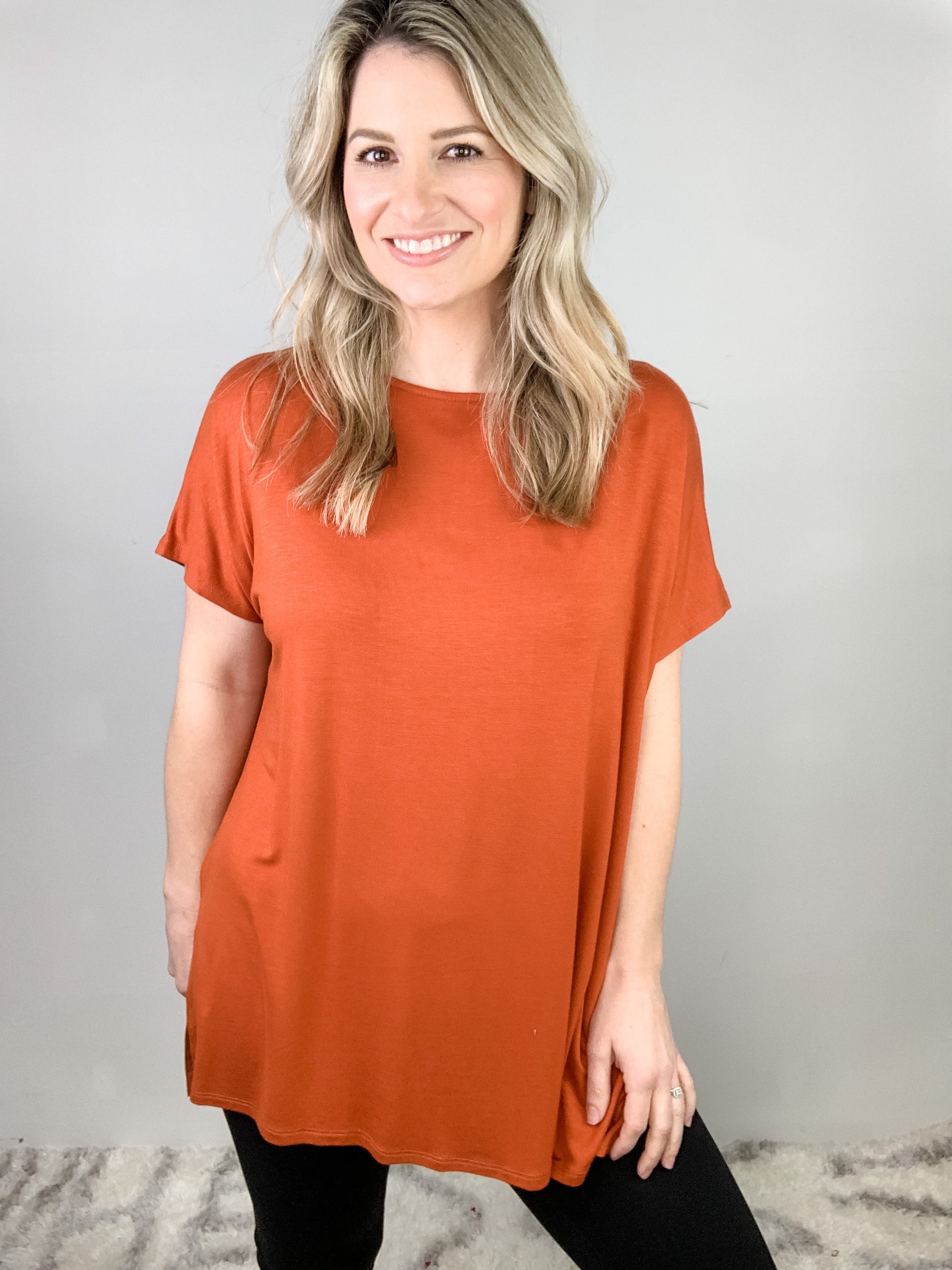 Closet staple!!! This top will look great styled with anything! The flowy fit is great on any body shape! Wear flowy or with a front tuck! Short sleeve top featuring dropped shoulder, round neckline, and flowy fit! Super soft, lightweight fabrication. Made in USA. 95% rayon 5% spandex.