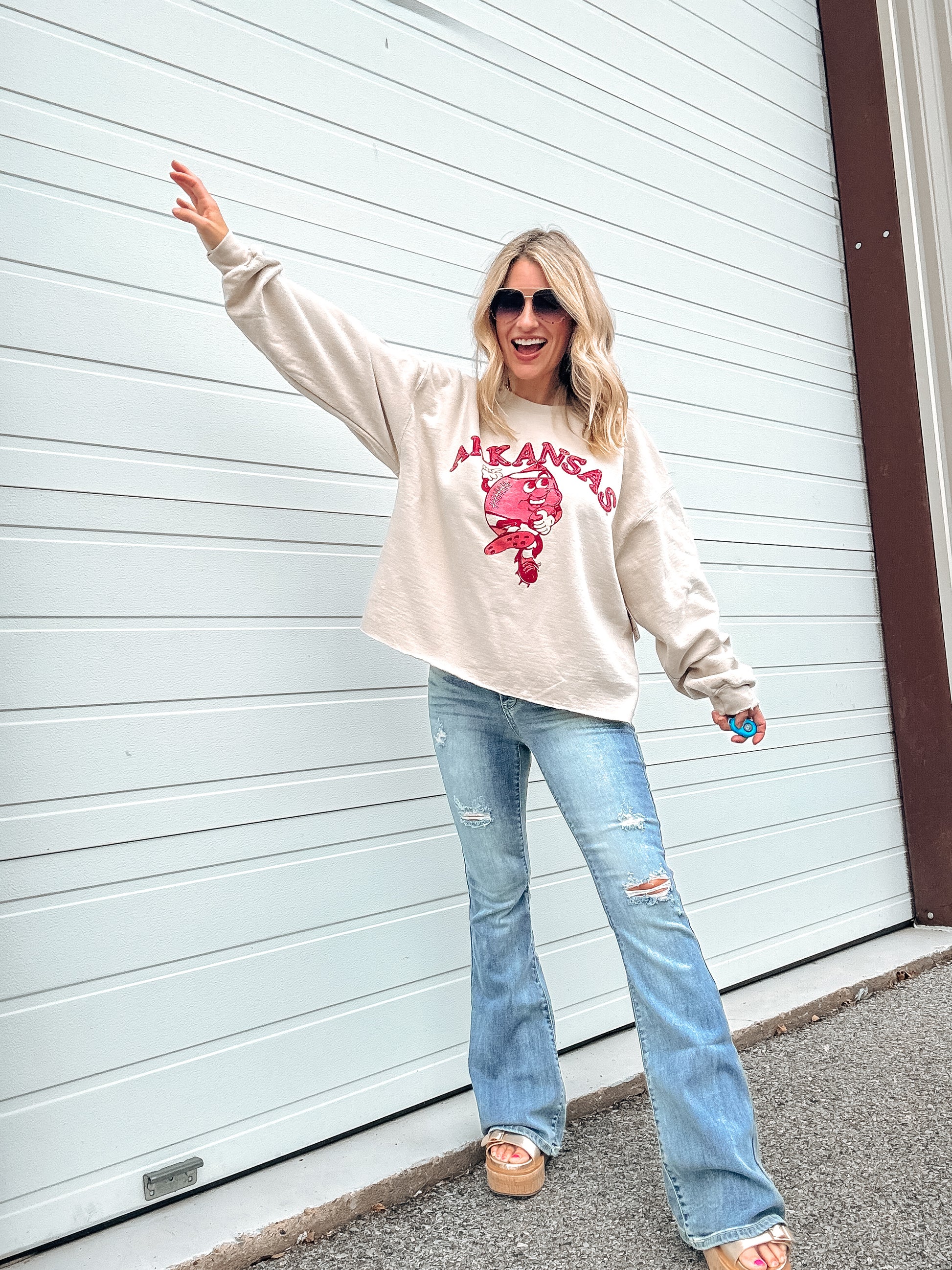 Get game-day ready in this retro Arkansas football sweatshirt! With a vintage-inspired design and a trendy raw hemline, it's perfect for cheering on the Hogs in style. Whether you're tailgating or lounging at home, this cozy sweatshirt has you covered.