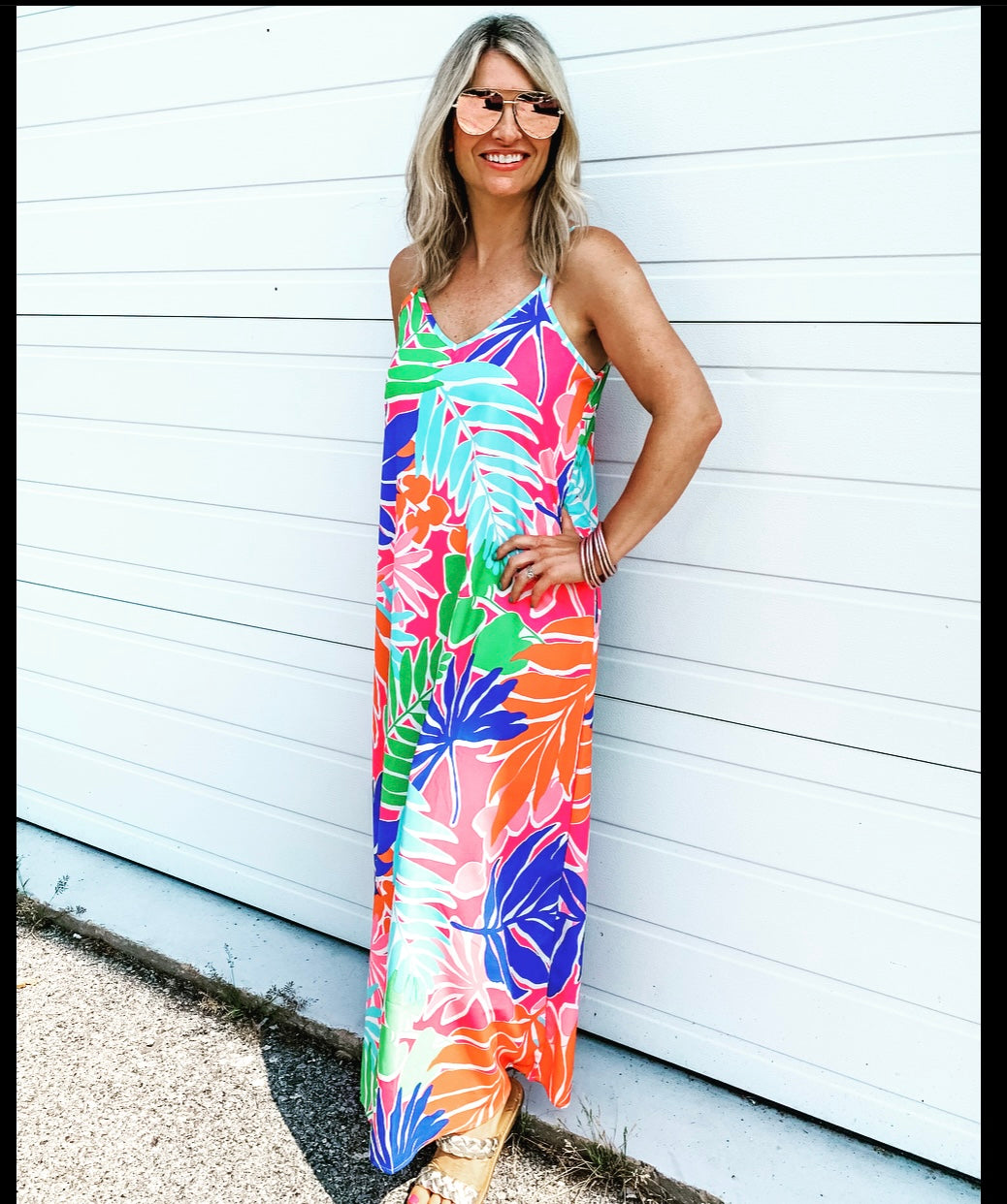 Bright & Cheerful Leaf Print Maxi Dress in Pink Multi