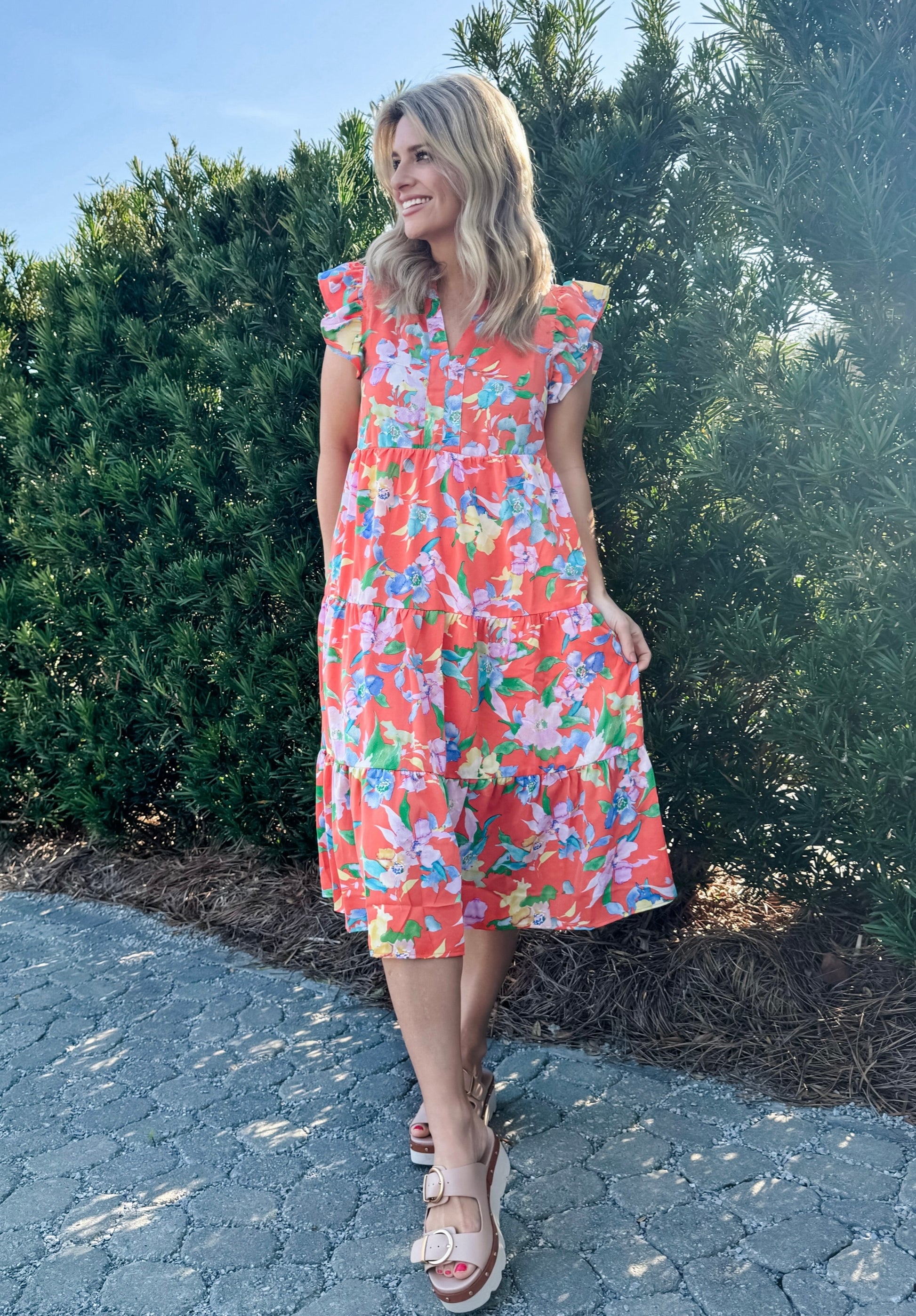 Get ready to turn heads in our Floral Print Midi Dress! The ruffled sleeves and placket neckline add playful detail to this lightweight, lined dress. With pockets for practicality, you'll be carefree and stylish on your next springtime stroll. Fit is true to size with a relaxed fit.