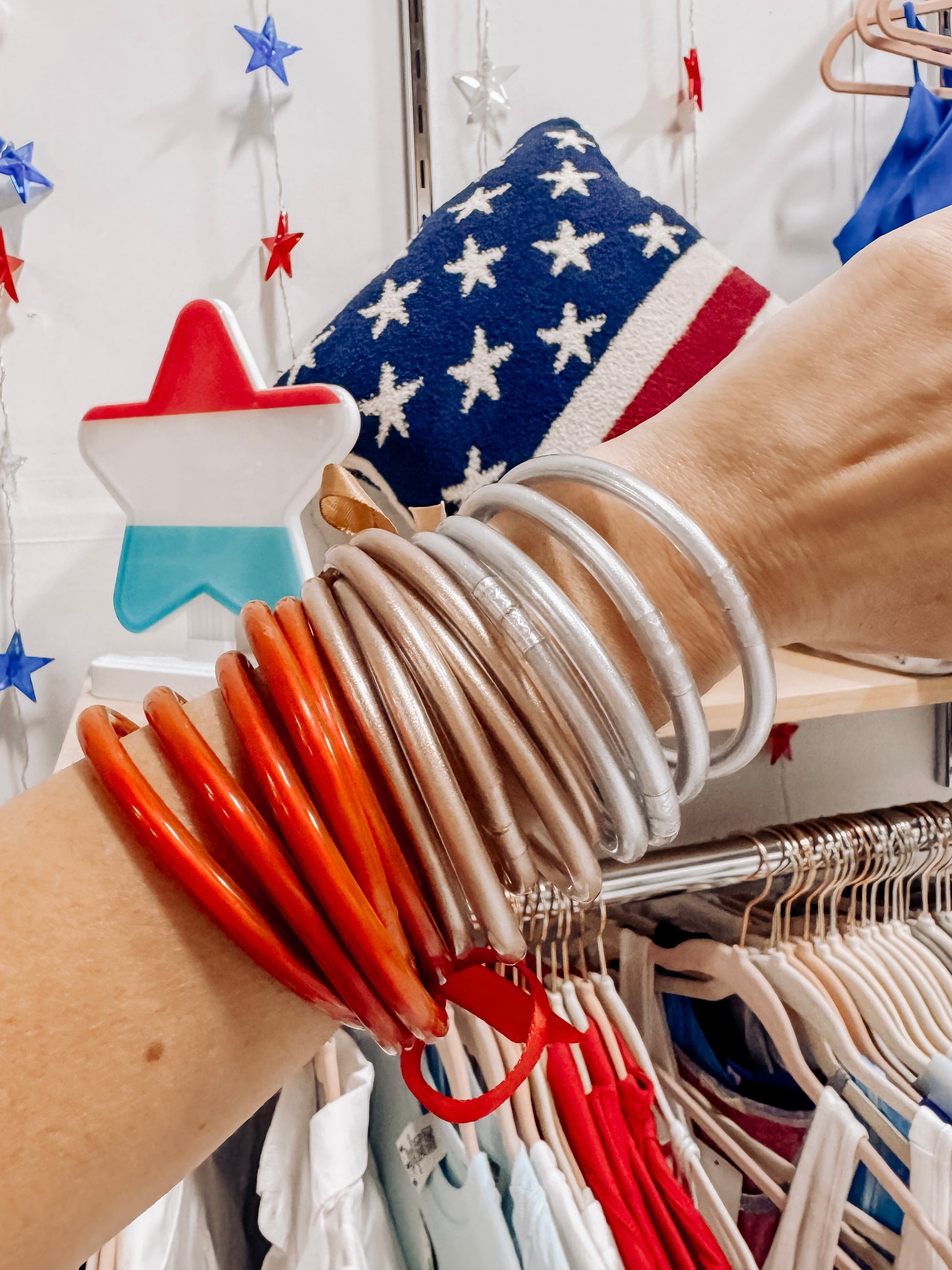 Introducing the Jelly Bangles - the perfect set of 5 bangles in a vibrant red color. These waterproof bangles don't clank or make a sound, and they're so lightweight that you'll forget you're even wearing them! Perfect for adding a pop of color to any outfit.