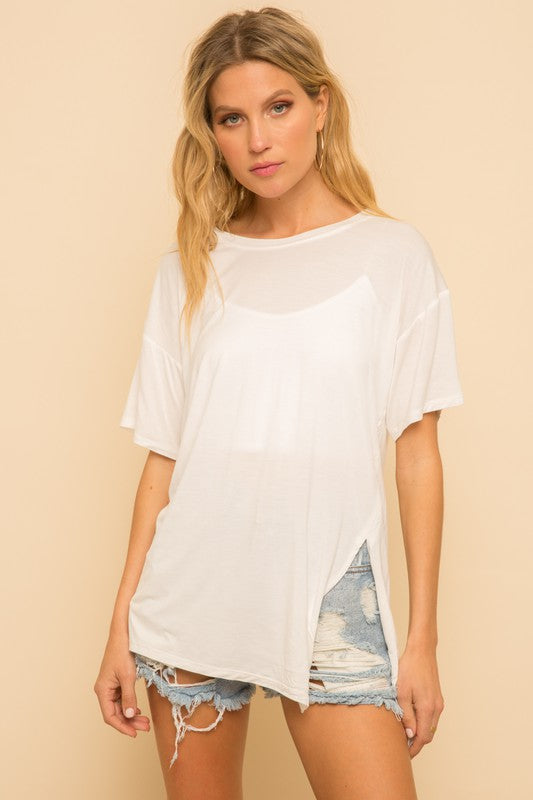 Simple white tee with fun side slit detail! Option to leave it down or tie it up! Super soft knit that is lightweight with a relaxed fit. 96% rayon 4% spandex.