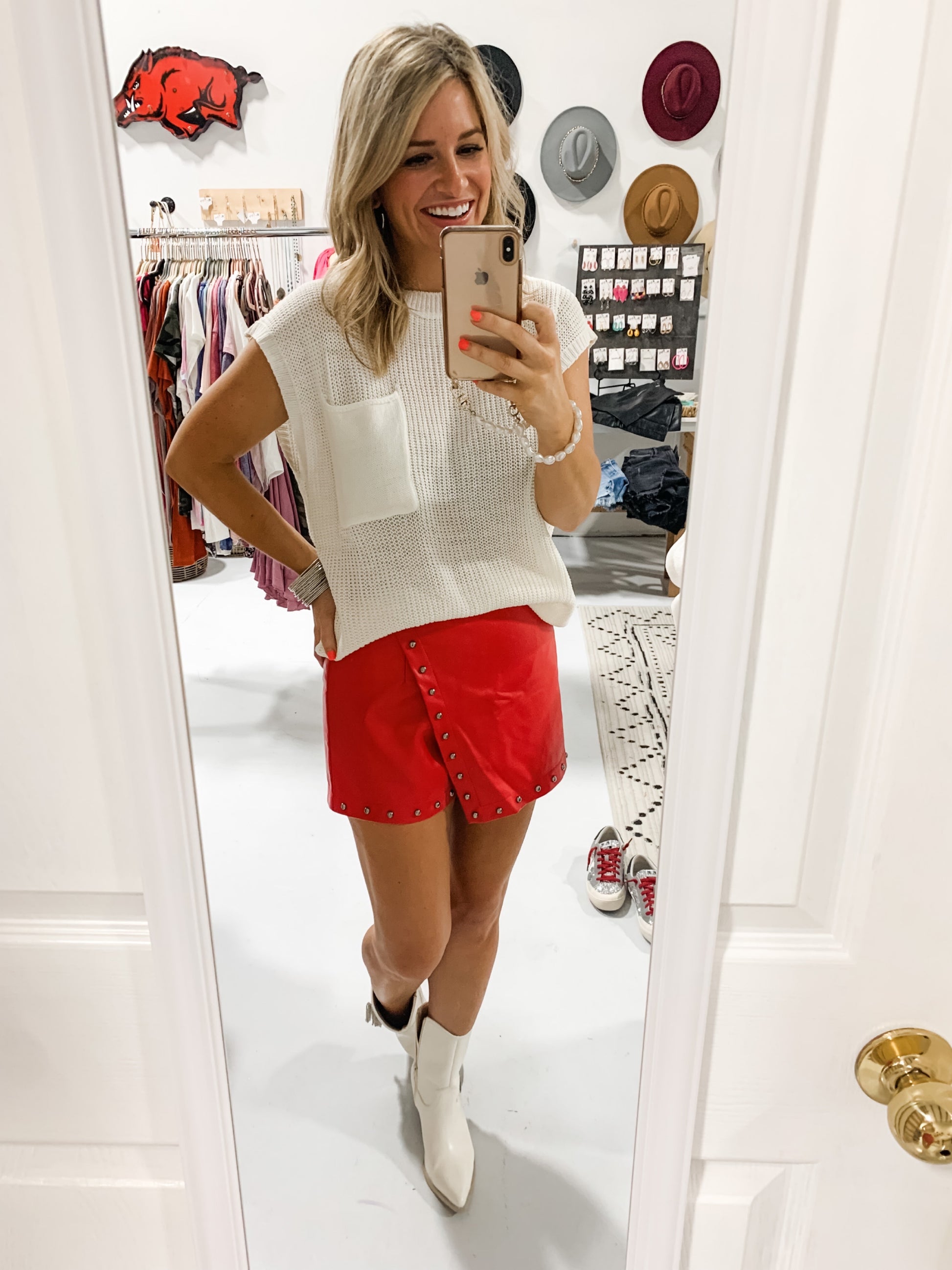 This vegan leather wrap skort is sure to make a statement! Featuring red vegan leather fabric with eye-catching studded detailing, this fun piece has a zipper closure in the back for a secure fit. Stand out from the crowd with this stunning style!
