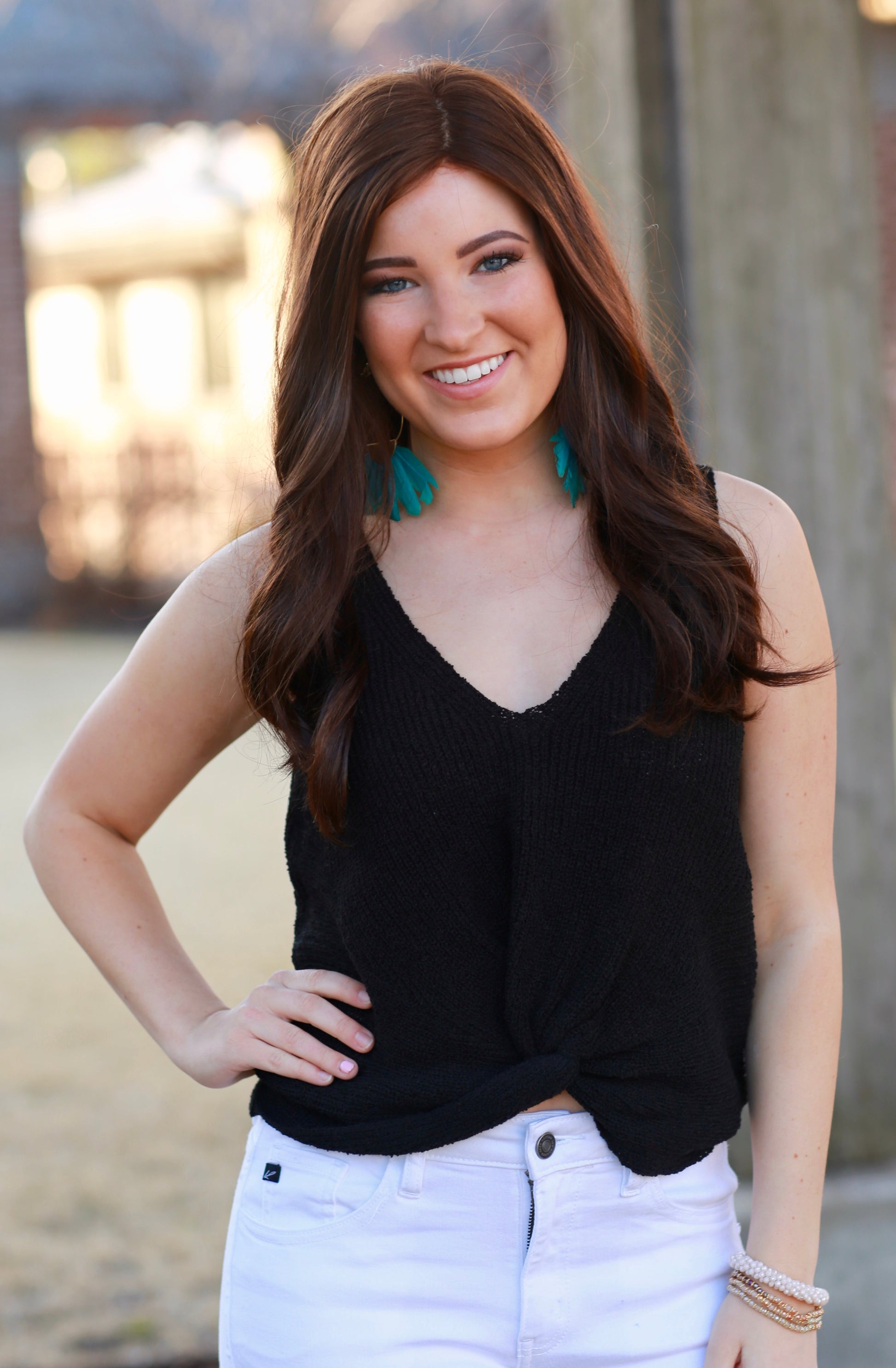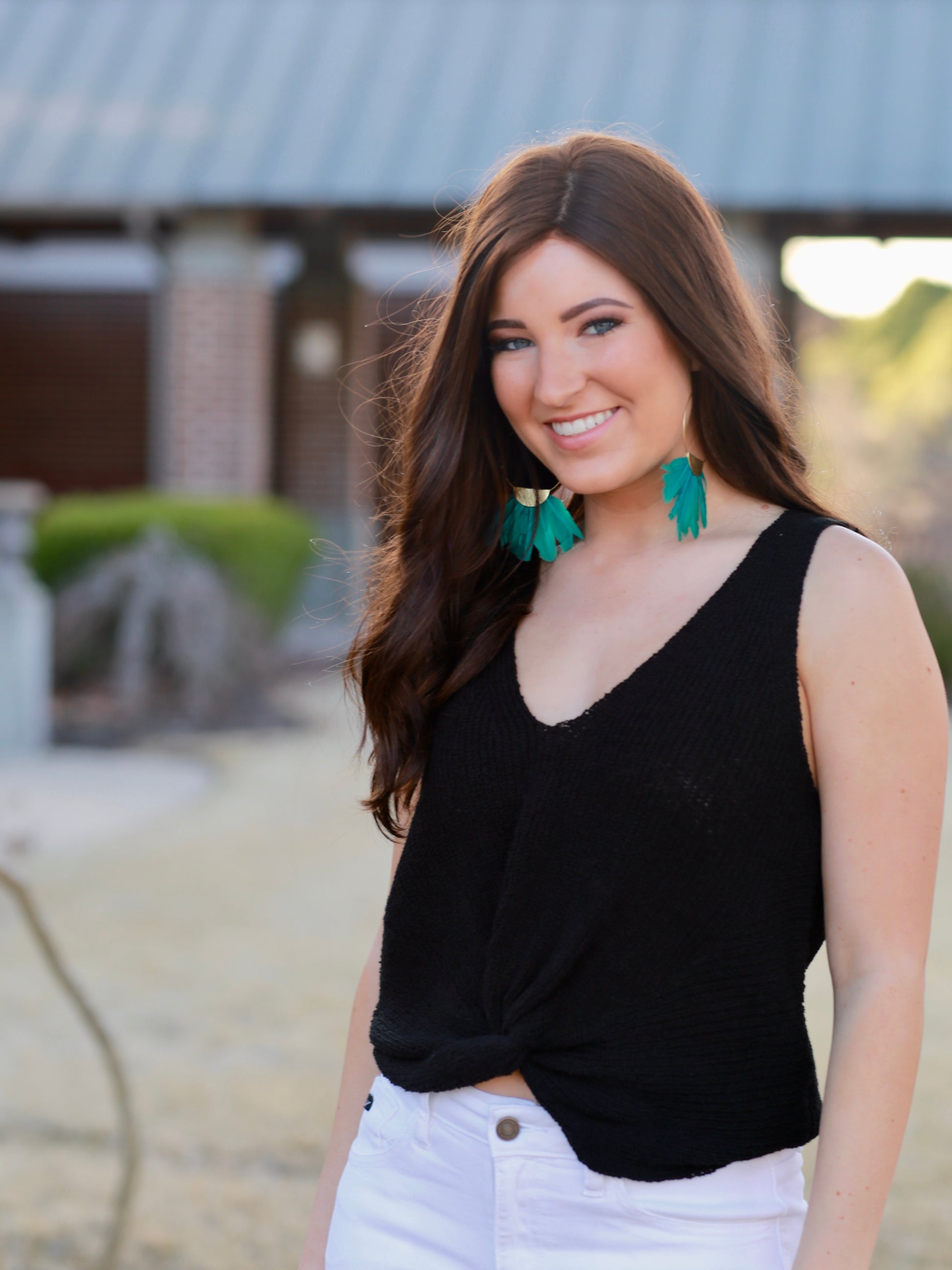This sleeveless sweater is perfect for work or play! Textured rib knit lightweight sleeveless sweater with fun twisted front hem detail. V-neckline. This versatile piece is great for layering, wearing alone, and will be a staple in any closet! 40% acrylic 40% polyester 20% linen. Green, Ivory, Twig, or Black.