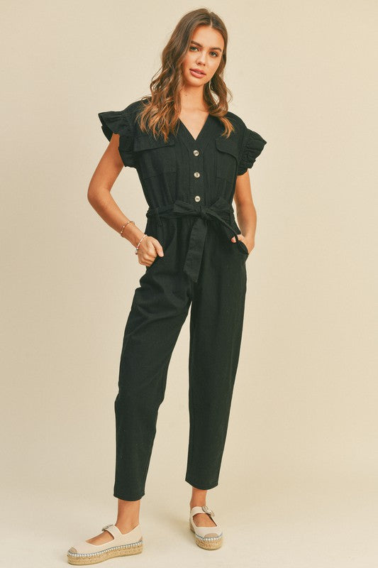 Utility Jumpsuit with Ruffle Sleeve in Black - medium